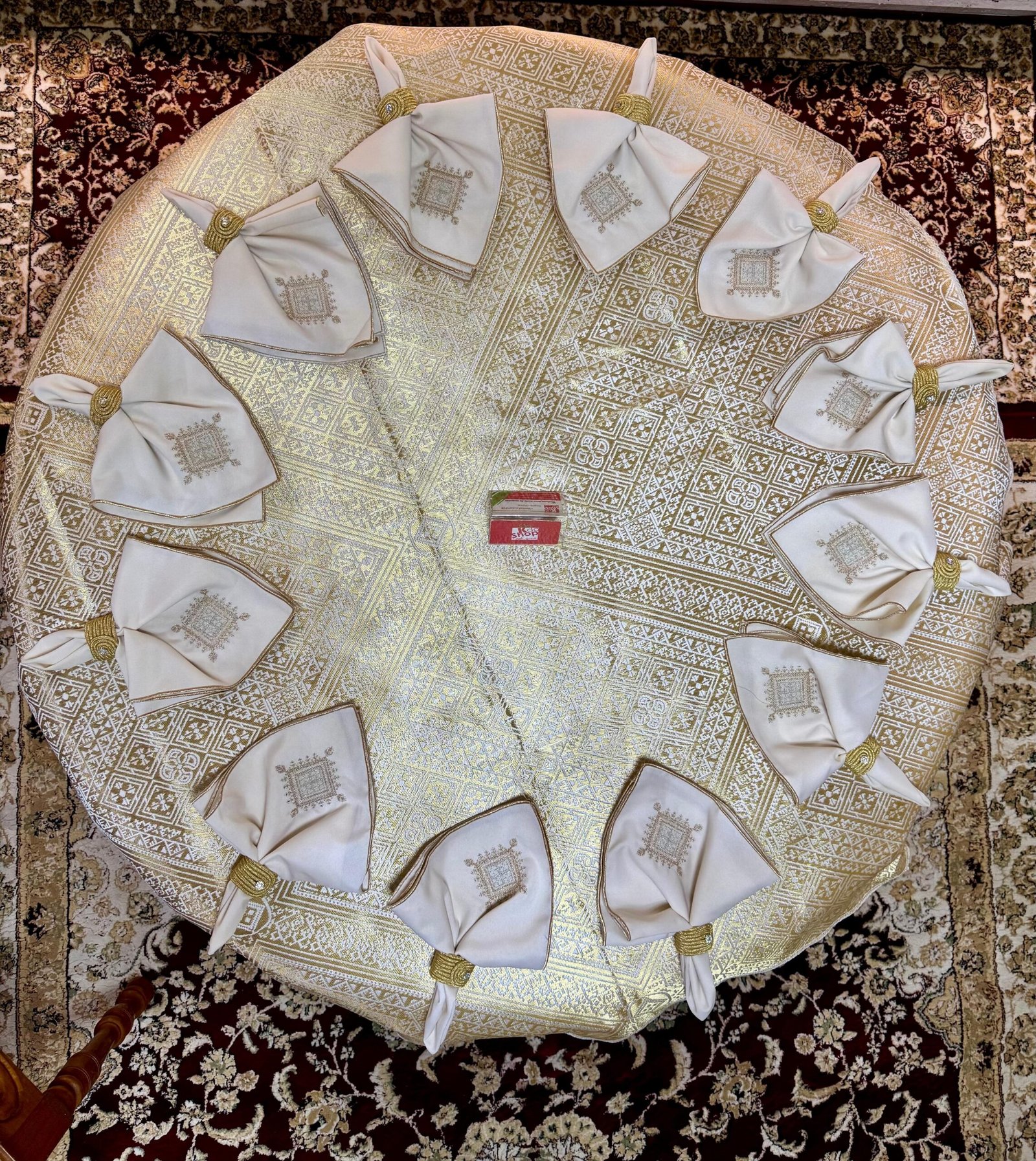La nappe est accompagnée de 12 serviettes assorties, finement brodées et soigneusement confectionnées, offrant une parfaite harmonie avec l’ensemble. Chaque serviette est pensée pour sublimer la présentation de table, idéale pour les réceptions, fêtes, mariages, Ramadan ou grandes occasions.