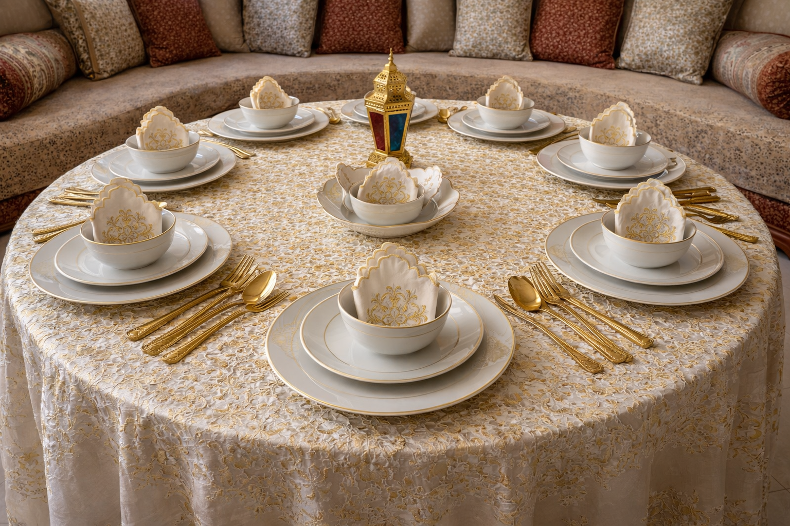 Fabriqué avec soin, ce service associe une finition blanche lumineuse à de délicats motifs dorés, offrant une allure chic et harmonieuse qui s’intègre parfaitement à tous les styles de décoration, notamment les tables élégantes et les salons marocains.